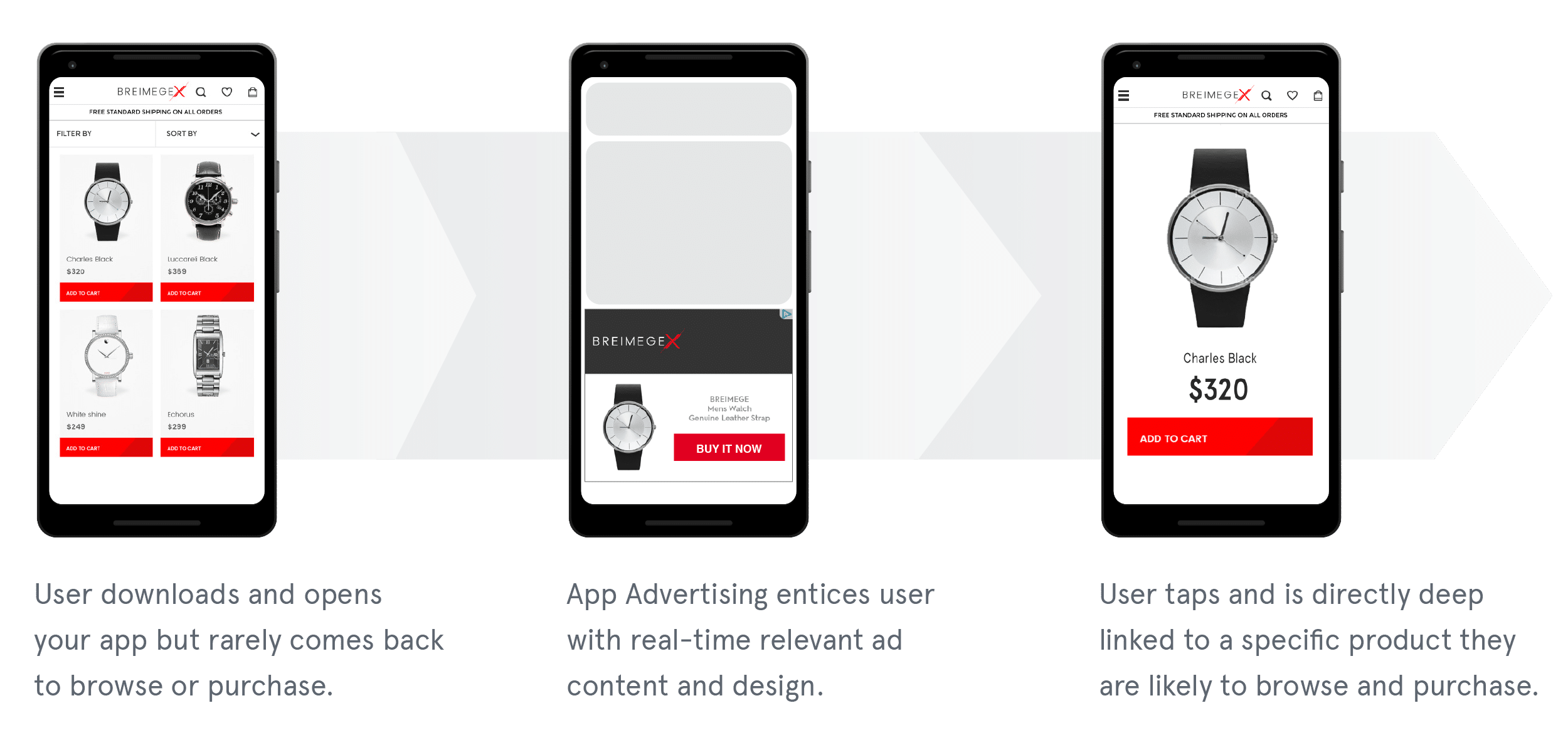 Say Bill is looking for a watch in your app but decides he isn’t ready to purchase just yet. As he browses, his intent data is captured, and after he leaves to visit another app, he sees an ad for the watch he was looking at, as well as some related products. He clicks the ad and is taken directly to the product page within your app to complete his purchase.