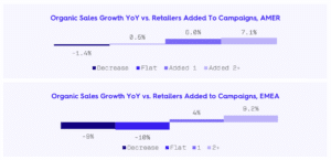 Brands that added two or more retailers to their campaign strategy saw year-over-year organic sales rise by 7.1% in AMER and 9.2% in EMEA. In contrast, brands that consolidated to fewer retailers saw steep declines, as much as -9%.