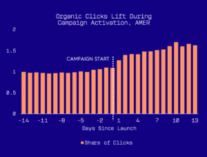 Marketers often think of paid and organic media as separate channels—but the data tells a different story. Just two weeks after campaign activation, daily organic clicks on retail search pages increased by 56% in AMER and 23% in EMEA. Importantly, the share of total clicks rose by 1.5x in AMER and 1.2x in EMEA, meaning shoppers were increasingly choosing your product detail pages over your competitors’.