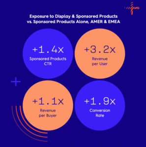 Campaigns don’t work in silos, and neither should your ad formats. Shoppers exposed to both Display and Sponsored Products generated 3.2x more revenue per user compared to those who only saw Sponsored Products. They also clicked more often and converted at higher rates.