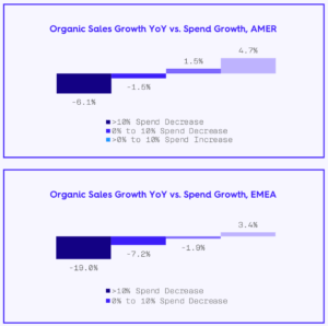 Brands that increased retail media spend by more than 10% saw meaningful organic sales growth: +4.7% in AMER and +3.4% in EMEA. In contrast, brands that reduced spend saw sharp declines, with losses reaching -19% in EMEA.