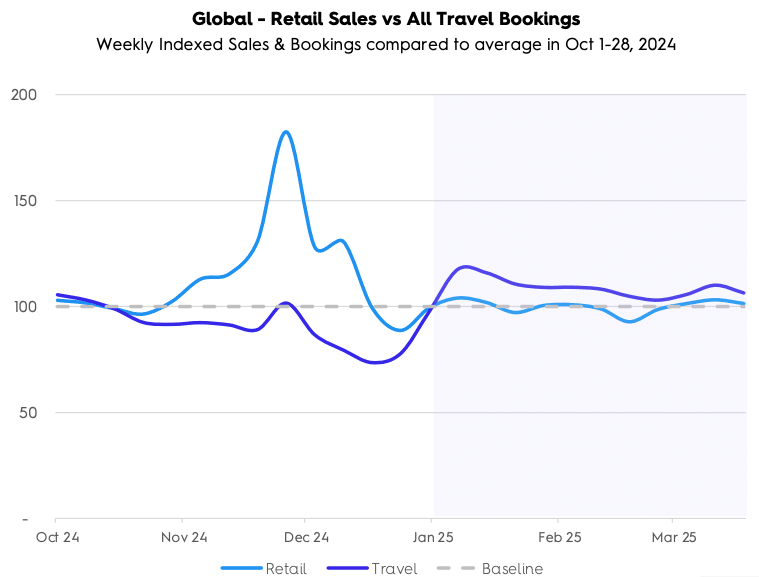From January through early spring 2025, travel bookings outperformed retail sales across every region—by 17 index points in EMEA, 14 points in APAC, and 27 points in the Americas, where demand accelerated steadily after the holidays.