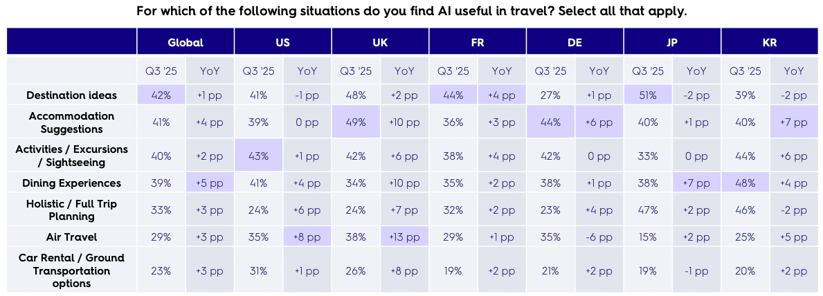 AI adoption continues to climb across regions, becoming a natural part of how people plan their journeys. In the US, usage rose 6 points for full trip planning and 8 points for air travel year over year. Travelers in the UK showed even greater momentum, with increases of 6 points for activities, 10 points for dining, 7 points for full trip planning, and 13 points for air travel.