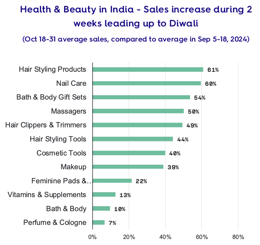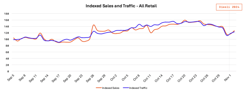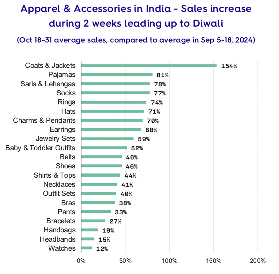 In the lead-up to Diwali, Fashion sales more than doubled, led by coats and jackets (+154%), saris and lehengas (+78%), and pajamas (+81%).