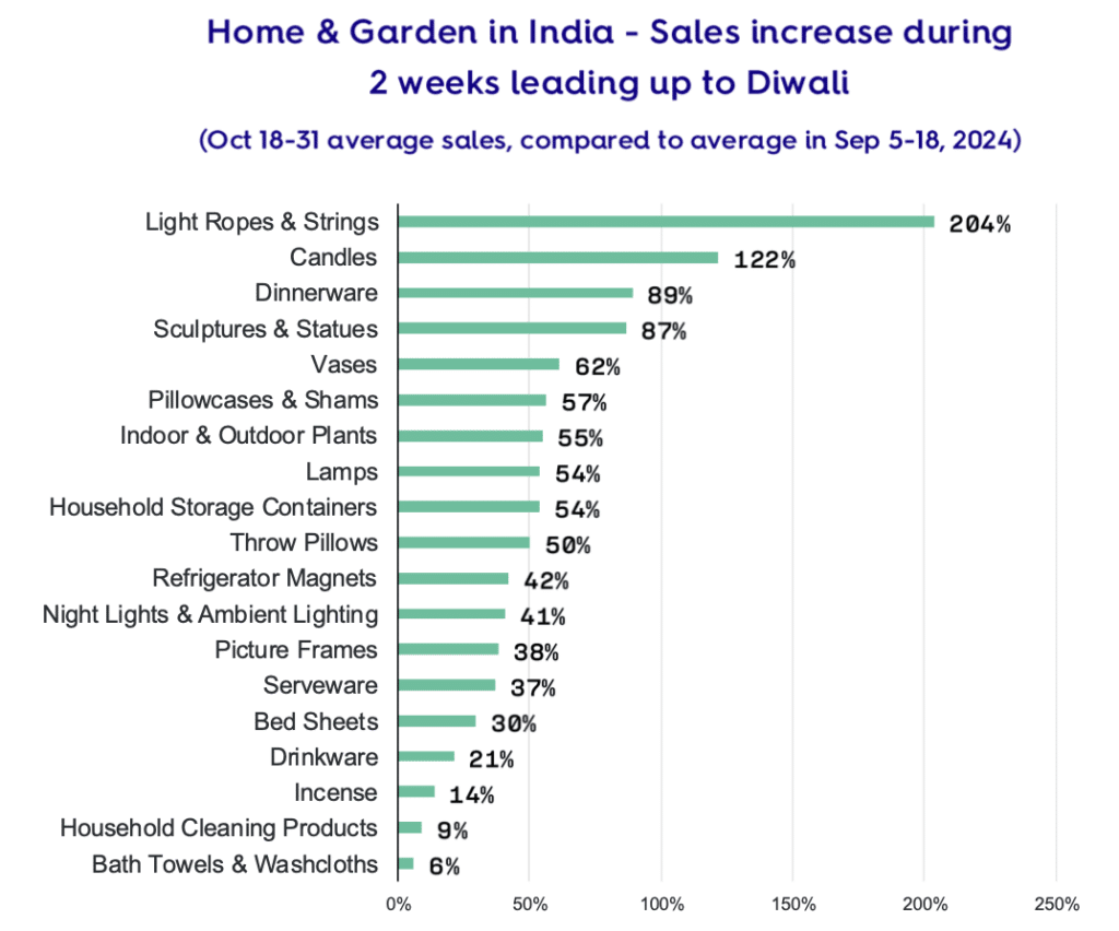 Home & Garden categories saw equally festive growth, with light ropes (+204%), candles (+122%), and dinnerware (+89%) topping the list.