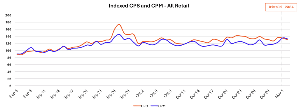 Competition for shopper attention is fierce. In 2024, CPMs peaked at +30% on October 20 and stayed above +20% in the final days before Diwali. CPCs averaged 29% above baseline in October and reached +33% in the last week.