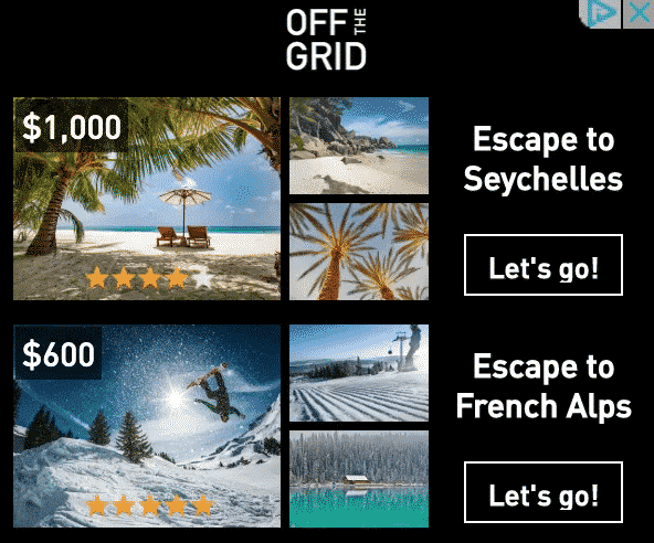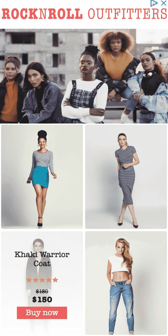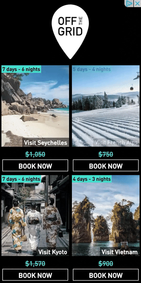 Gera cliques com um pacote de criativos perfeitos para qualquer preferência de usuário, tamanho de publisher e contexto. O layout modular de grades adapta-se para mostrar mais ou menos produtos, de acordo com cada impressão.