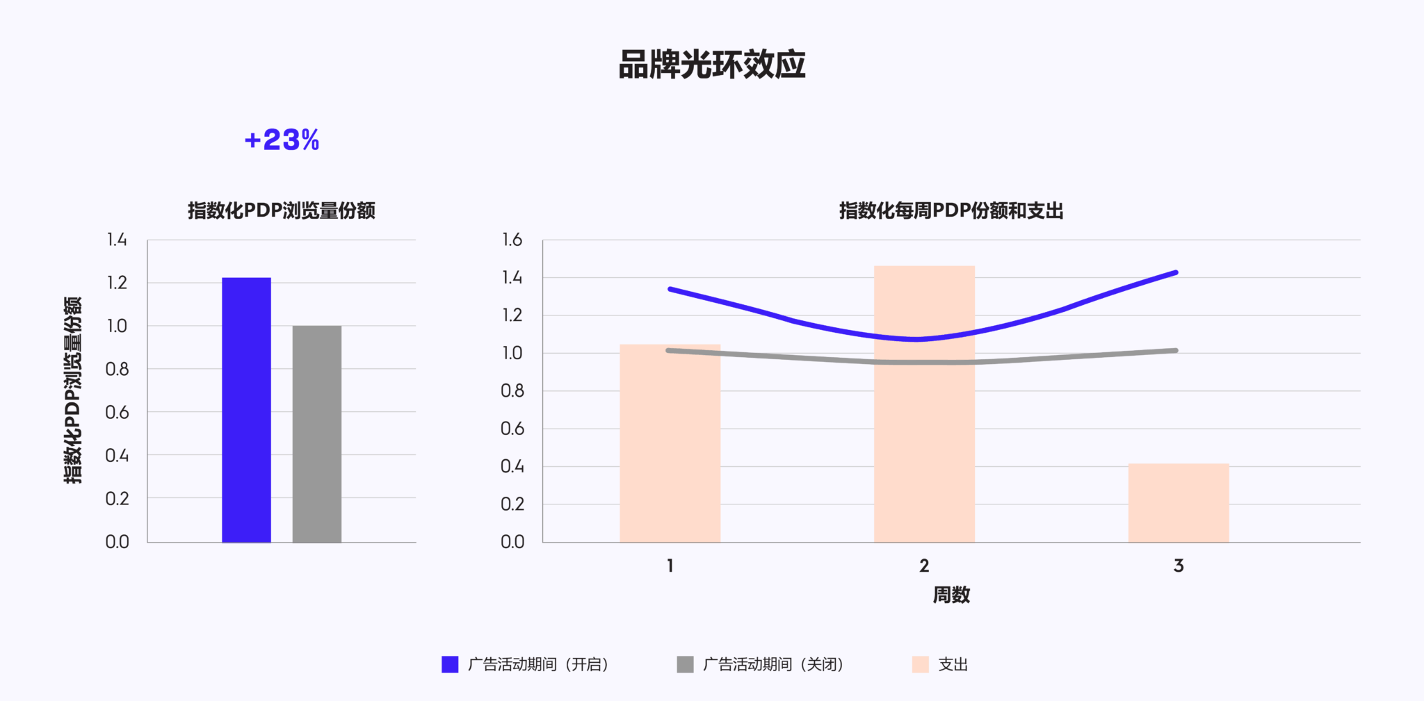 广告活动提升了消费者的互动性,推动产品详情页面浏览量增长15%。“零食与糖果”品类的收入份额增长15%,进一步证实了广告活动对增量销售额的推动作用。此外,品牌光环效应也起到了拉动作用,使得产品详情页面在关联品类的市场份额提升了11%,收入份额也增长了9%。