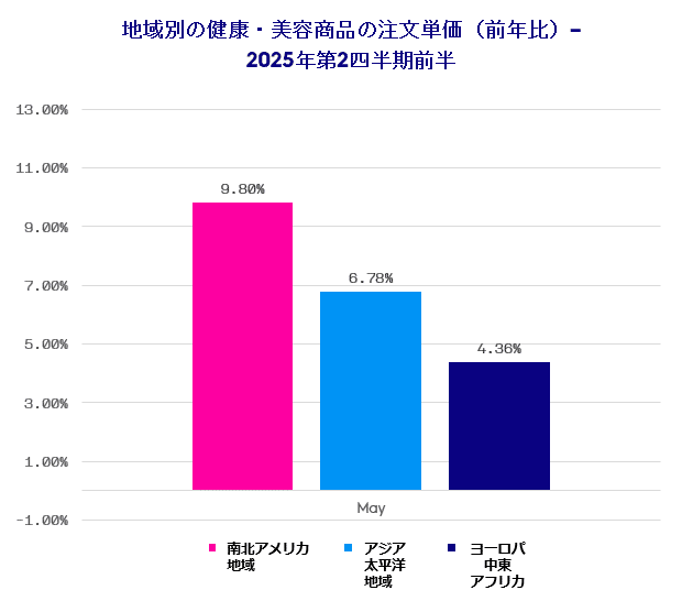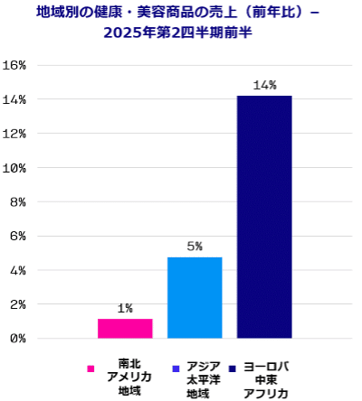 2025年第2四半期の前半、健康・美容分野の売上は全地域で著しく増加し、ヨーロッパ・中東・アフリカで14%、アジア太平洋地域で5%、南北アメリカ地域で1%の増加を記録しました。