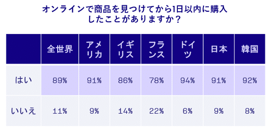 注目すべきは、全世界の89%が美容商品を初めて見たその日に購入したことがあると答えている点です。