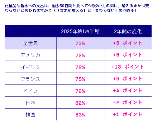 美容商品に対する支出は堅調で安定的です。過去6か月間の美容に対する支出が「変わらない」または「増えた」と答えた消費者は84%に上り、今後も支出を「維持する」または「増やす」予定であると答えた消費者は73%に上ります。