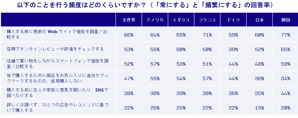 美容商品の購入者は慎重に商品を選択します。世界的に見ると、消費者の66%がオンラインで価格を比較し、53%がレビューを確認し、52%が店頭でモバイル端末で価格を比較しています。