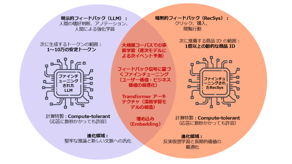 図3:共通するDNA、異なる課題: LLM とレコメンドシステムはどちらも、埋め込み、トランスフォーマー、ファインチューニングを基に構築されたシークエンスモデルですが、フィードバック信号、アイテム空間、そして研究の方向性において異なる進化を遂げています。