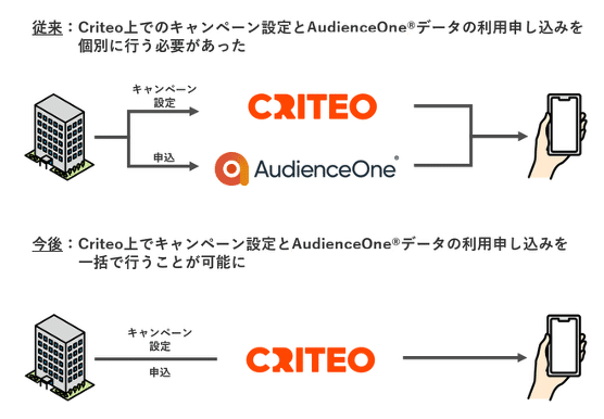 株式会社Hakuhodo DY ONE(所在地:東京都港区、代表取締役会長:田中雄三 代表取締役社長:小坂洋人、以下 Hakuhodo DY ONE)が開発・提供するDMP「AudienceOne®」*1と、CRITEO株式会社(クリテオ、本社:フランス、日本代表取締役社長:グレース・フロム、以下 Criteo)のDSP「Commerce Growth」*2がこのたびデータ連携を大幅に強化しましたのでお知らせいたします。これにより、企業はCriteoの管理画面上で「AudienceOne®」のオーディエンス選択および申し込みが可能となり、ターゲティング広告配信の設定がCriteo上で完結できるようになります。個別のオーディエンス連携の申し込みが不要となることで、よりシームレスでタイムリーな広告配信を実現します。