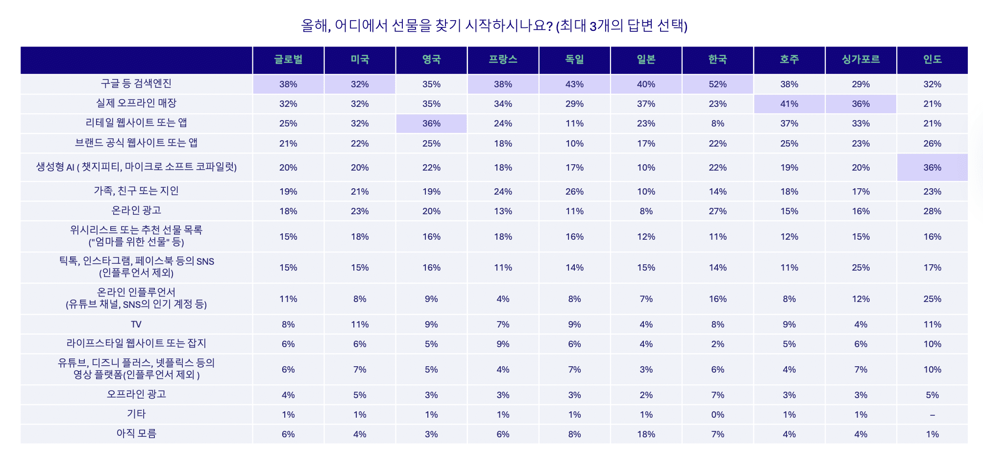 검색 엔진으로 선물을 발견(discovery)하는 경우가 가장 많고 그 다음은 유통사(리테일러) 사이트와 브랜드 사이트 순입니다. 올해는 상당 비율(20%)의 고객들이 아이디어를 얻기 위해 생성형 AI를 활용할 계획이라고 답했습니다. 따라서 피드와 온사이트 콘텐츠는 AI와 SEO를 최적화해, 구매 여정이 시작되는 모든 곳에서 제품이 명확하게 노출되도록 하는 것이 중요합니다.