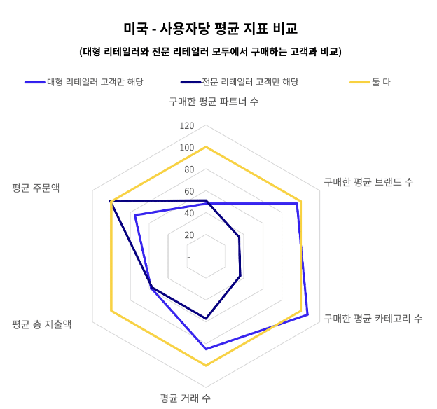 대형 리테일러만 이용하는 소비자와 달리, 전문 리테일러에서만 쇼핑하거나 두가지 모두를 함께 이용하는 소비자는 더 많은 파트너에서 구매하고, 주문 횟수도 많으며 주문당 금액과 총 결제액도 더 높습니다. 즉, 전문 리테일러 고객은 마케터에게 매우 가치 있는 고객이라고 할 수 있습니다.