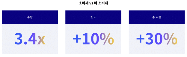 장바구니에 담긴 소비재(생필품)는 결제를 유도합니다. 6개월간 데이터를 보면, 소비자는 비소비재 상품보다 생필품에서 3.4배 더 많은 상품을 구매하고, 약 10% 더 자주 거래합니다. 그 결과, 생필품에 대한 총 지출은 약 30% 더 높게 나타나 필수 생활용품이 장바구니를 키우고 매출을 견인한다는 사실을 보여줍니다. 또한, 생필품이 포함된 장바구니는 이탈율이 9% 낮아 생필품이 있을 경우 결제를 완료할 가능성이 더 높다는 점도 확인할 수 있습니다.