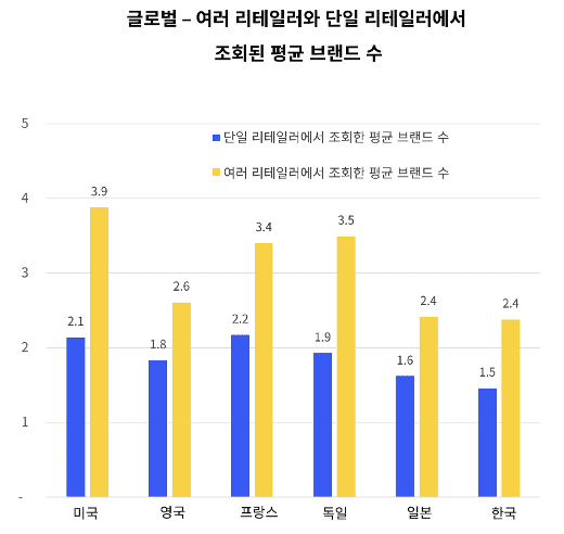 소비자가 여러 리테일러 사이트를 오가며 쇼핑하면, 단일 사이트에만 머물렀을 때보다 최대 80% 더 많은 브랜드를 접하게 됩니다. 방문하는 리테일러 수가 많아진다는 것은 그만큼 경쟁 브랜드도 늘어난다는 의미지만, 동시에 브랜드가 소비자에게 노출될 기회 역시 함께 증가합니다.