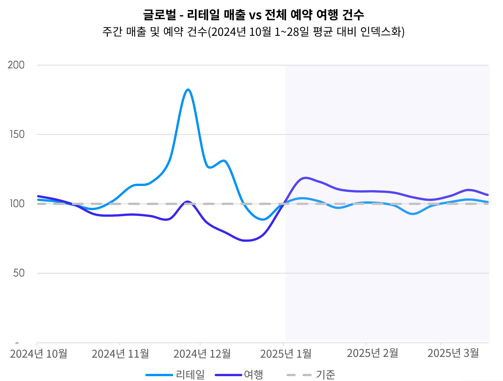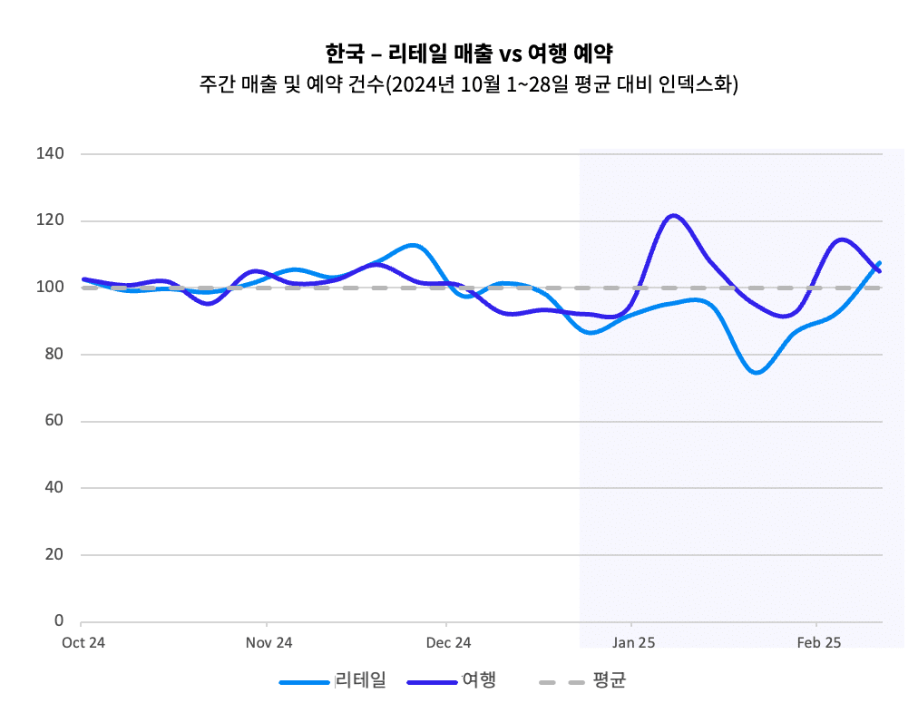 2025년 1월부터 초봄까지, 전 세계적으로 여행 예약이 리테일 매출보다 더 빠르게 증가하며 연말 이후에도 여행 수요가 꾸준히 이어졌습니다. 특히 유럽·중동·아프리카(EMEA) 지역은 17포인트, 아시아태평양(APAC) 지역은 14포인트, 미주 지역은 27포인트 상승하며, 여행에 대한 관심이 빠르게 회복되는 모습을 보였습니다. 한국 시장의 흐름은 더욱 뚜렷합니다. 여행 수요는 연말이 아닌 2월에 정점을 찍으며, 2월 중순에는 여행 관심도가 리테일 판매를 최대 26포인트까지 앞서는 것으로 나타났습니다. 이는 설 연휴가 있는 연초가 한국 소비자에게 본격적인 여행 시즌임을 시사합니다.