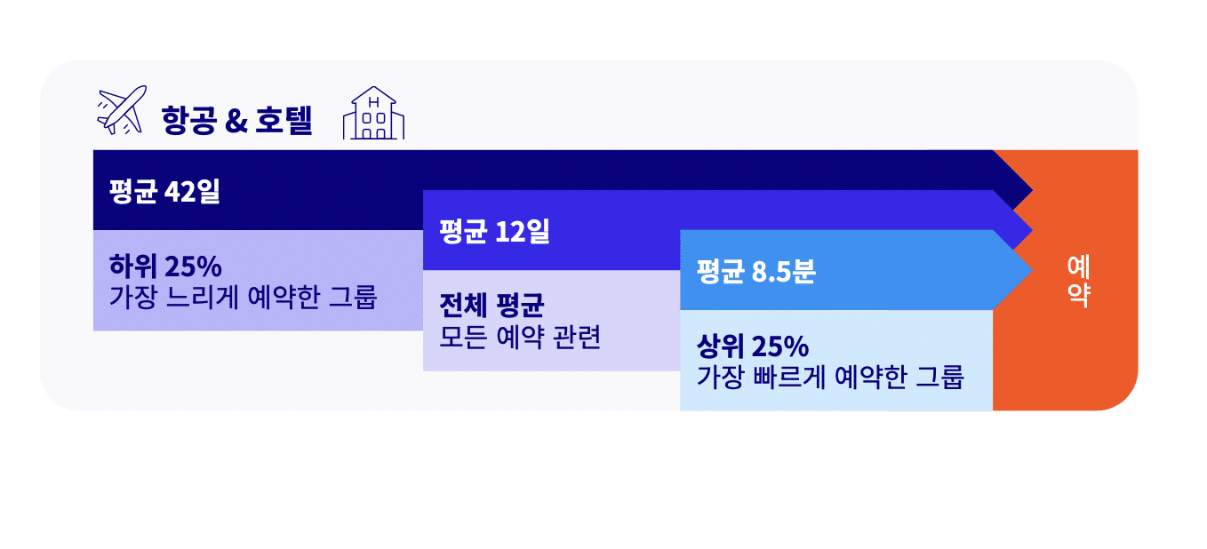 크리스마스와 새해가 끝난 뒤에도 여행에 대한 관심은 쉽게 식지 않습니다. 오히려 검색량은 꾸준히 증가하며, 12월에 여행 관련 검색을 한 한국 소비자는 바로 예약한 소비자보다 1분기에 예약할 가능성이 2배 더 높게 나타났습니다. 특히 한국 여행자들은 최종 결정을 내리기 전 평균 10개의 호텔을 비교하고, 항공과 호텔 예약을 마치기까지 약 12일 시간을 들입니다. 이는 글로벌 평균과 비슷한 수준으로, 여행 구매 여정이 점점 더 길고 신중해지고 있음을 보여줍니다.