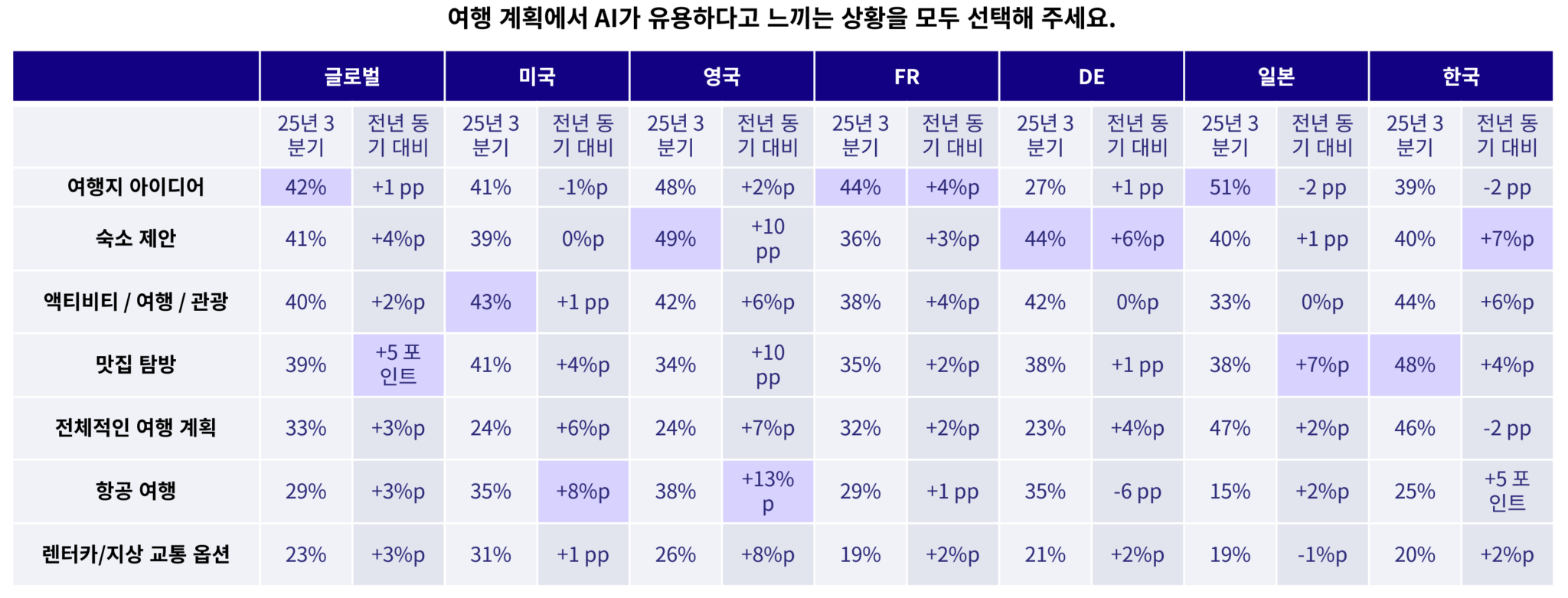 아시아태평양 지역에서도 유사한 흐름이 이어집니다. 일본에서는 AI를 활용한 맛집 탐색이 7포인트 증가한 반면, 한국은 여행 활동(6포인트), 항공 여행(5포인트), 맛집 발견(4포인트) 등 주요 영역 전반에서 고르게 성장했습니다.