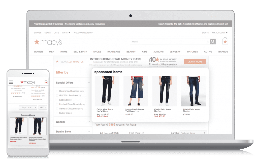 Criteo Sponsored Products 는 리테일러들의 웹사이트 및 앱의 전체 구매 경로에서 노출되는 네이티브 상품 광고입니다. 사이트에서 이미 판매되고 있는 탑 브랜드들로부터 수익 효과를 얻을 수 있습니다. 광고를 클릭한 소비자는 이탈없이 사이트 내에서의 쇼핑 여정을 이어가며 구매 전환에 이르게 되고, 입점 브랜드는 클릭당 비용을 지불하게 됩니다.