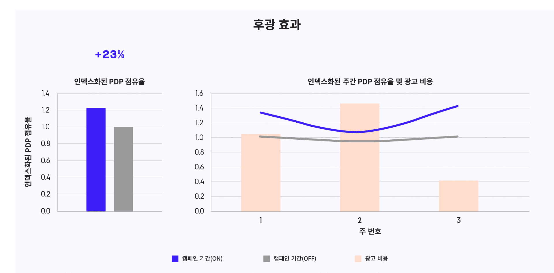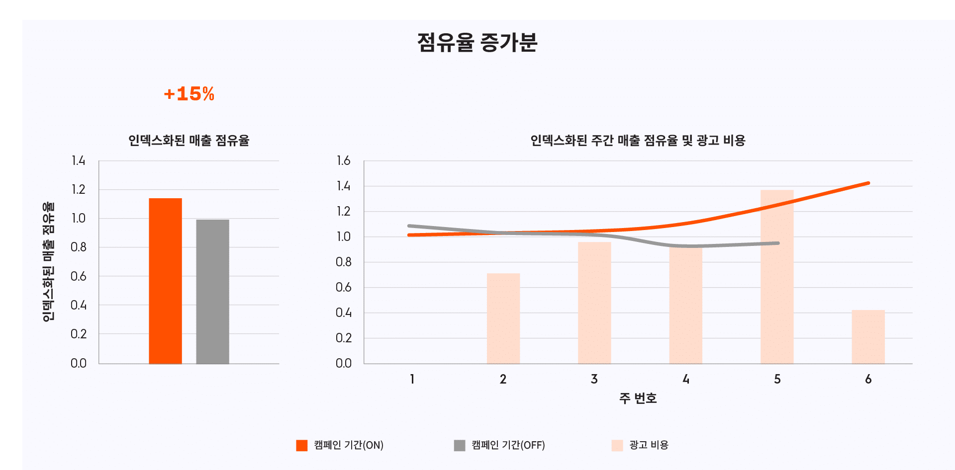 이 캠페인은 소비자의 관심을 유도해 상세 페이지 조회수가 15% 증가했습니다. 카테고리의 매출 점유율 역시15% 증가해 캠페인이 매출 증가에 확실하게 영향을 미친다는 사실을 보여주었습니다. 또한 관련 카테고리의상세 페이지 점유율이 11% 증가하고 매출 점유율도 9% 증가하는 등 후광 효과를 얻었습니다.