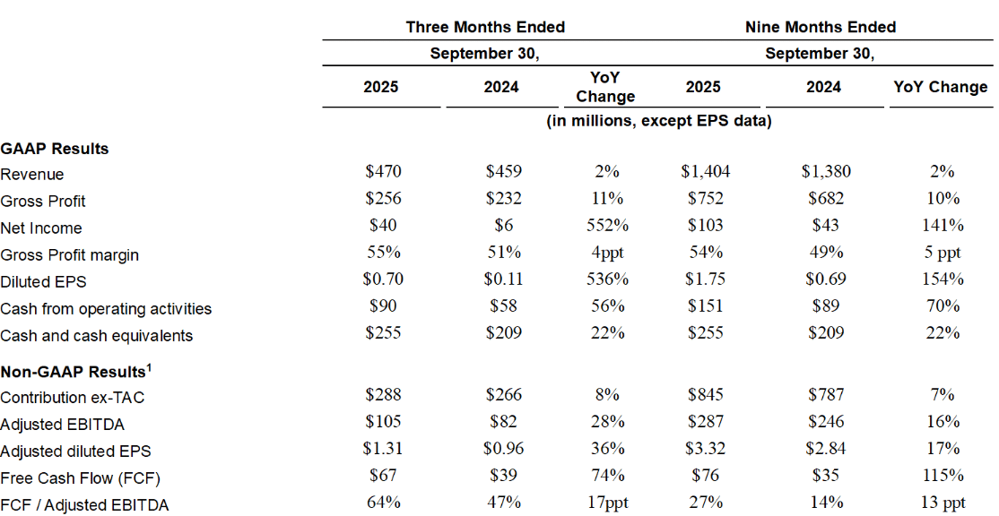 Revenue increased 2% year-over-year in Q3 2025, or was flat at constant currency, to $470 million (Q3 2024: $459 million). Gross profit increased 11% year-over-year in Q3 2025 to $256 million (Q3 2024: $232 million). Gross profit as a percentage of revenue, or gross profit margin, was 55% (Q3 2024: 51%). Contribution ex-TAC in the third quarter increased 8% year-over-year, or increased 6% at constant currency, to $288 million (Q3 2024: $266 million).